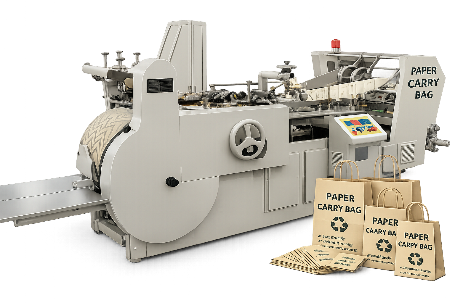 The machine processes kraft and recycled paper into finished carry bags through a smooth and controlled operation, ensuring clean edges, uniform folding, and reliable bottom support. It is suitable for businesses handling bulk packaging where consistent quality and output are important.